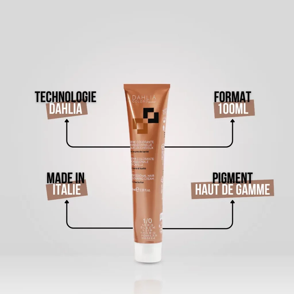 Crème Colorante avec Ammoniaque 100ml, d'origine italienne, contient des pigments premium et une technologie avancée pour mèches—un produit professionnel abordable avec un excellent rapport qualité/prix. Dahlia Color Professionnel