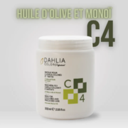 Masque Olive et Monoï C4, à la texture crème blanche avec étiquettes "huile d'olive" et "monoï", offre un excellent rapport qualité/prix pour un soin capillaire professionnel abordable. Dahlia Color Professionnel