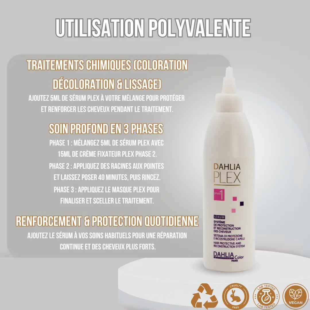 Sérum Plex Phase 1 (250 ml) de Dahlia Color : flacon avec notice en français, pour une utilisation polyvalente — traitement et protection des cheveux. Profitez d’un excellent rapport qualité/prix avec ce produit de coiffure professionnel pas cher. Dahlia Color Professionnel