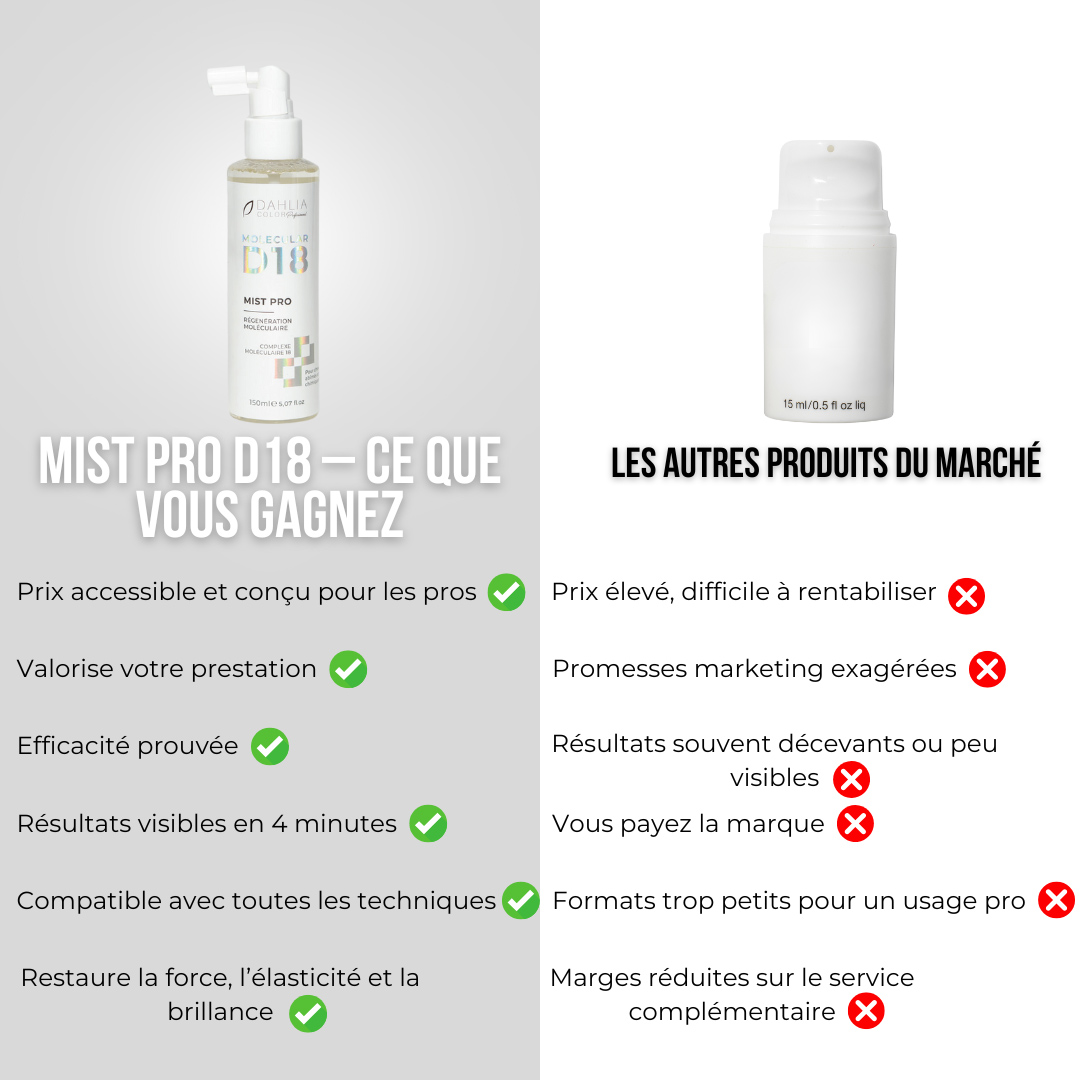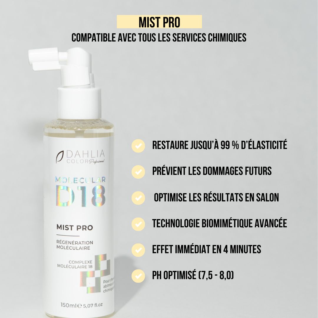 Le Mist Pro D18 est un soin sans rinçage qui prépare les cheveux avant un service technique (coloration, décoloration, lissage…).