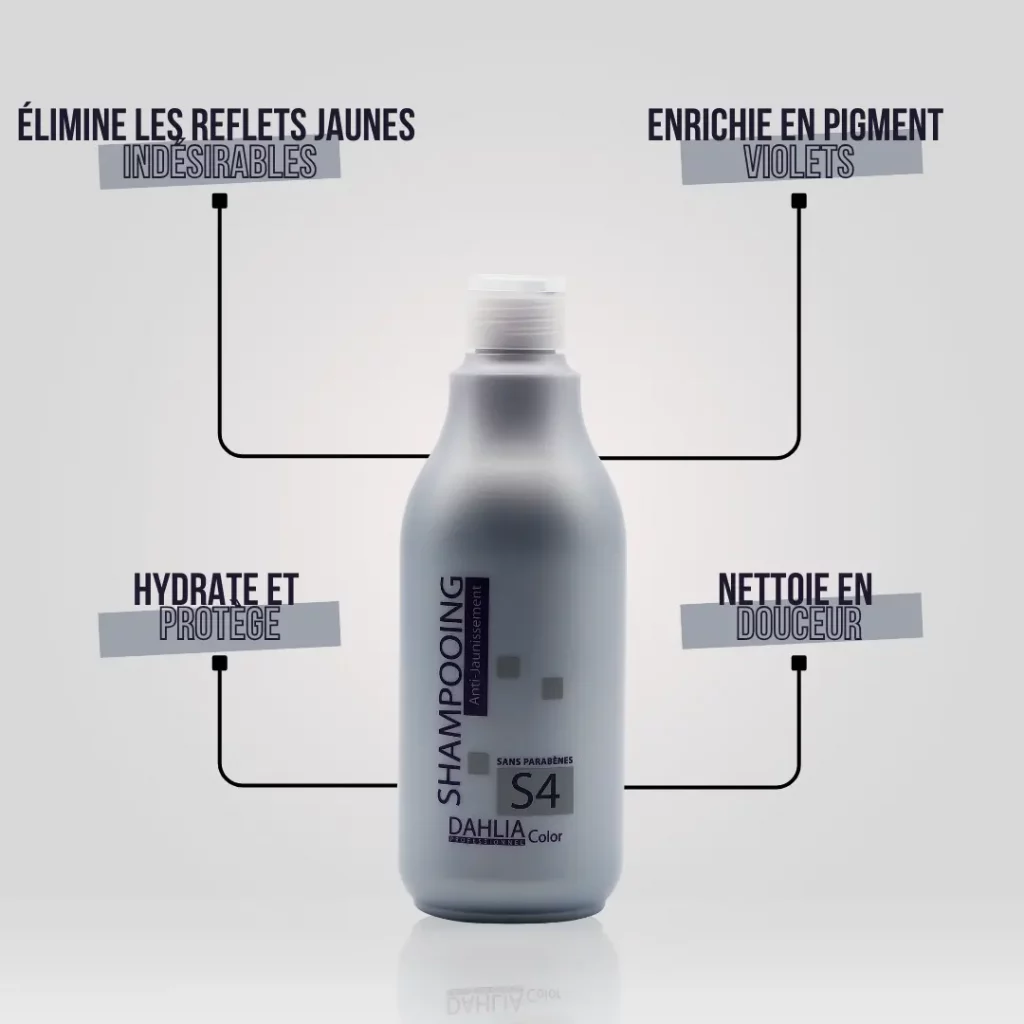 Le Shampooing S4 de Dahlia Color est spécialement formulé pour éliminer les reflets jaunes indésirables des cheveux blonds, gris ou décolorés. Grâce à son enrichissement en pigments violets, ce shampooing neutralise efficacement les tons chauds pour maintenir une couleur froide et éclatante tout en offrant un nettoyage doux.