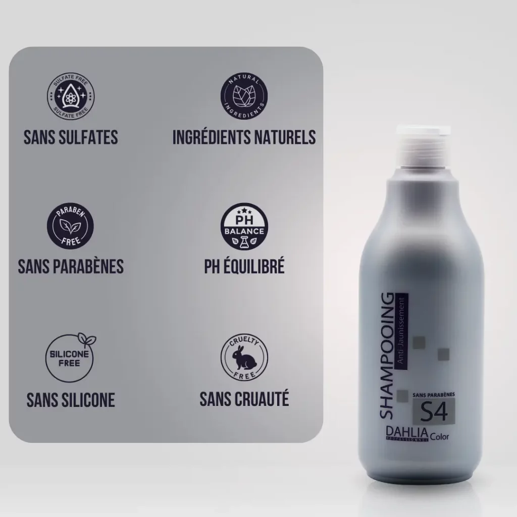 Le Shampooing S4 de Dahlia Color élimine les reflets jaunes des cheveux blonds, gris ou décolorés grâce à ses pigments violets. Formule douce, hydratante, vegan et éco-responsable en format pratique de 500ml pour une couleur froide et éclatante.